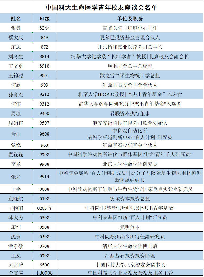 已确认出席校友既涵盖了主要的生命医学学术与工业界领域,也包括AI、生命医学影像、高分子材料等与生医紧密交叉的学科。这是民间、独立的中国科大北京校友会与新创校友基金会组织的民间校友活动。旨在促进中国科大生医校友的交流与合作;激励交叉学科的融合创意。
