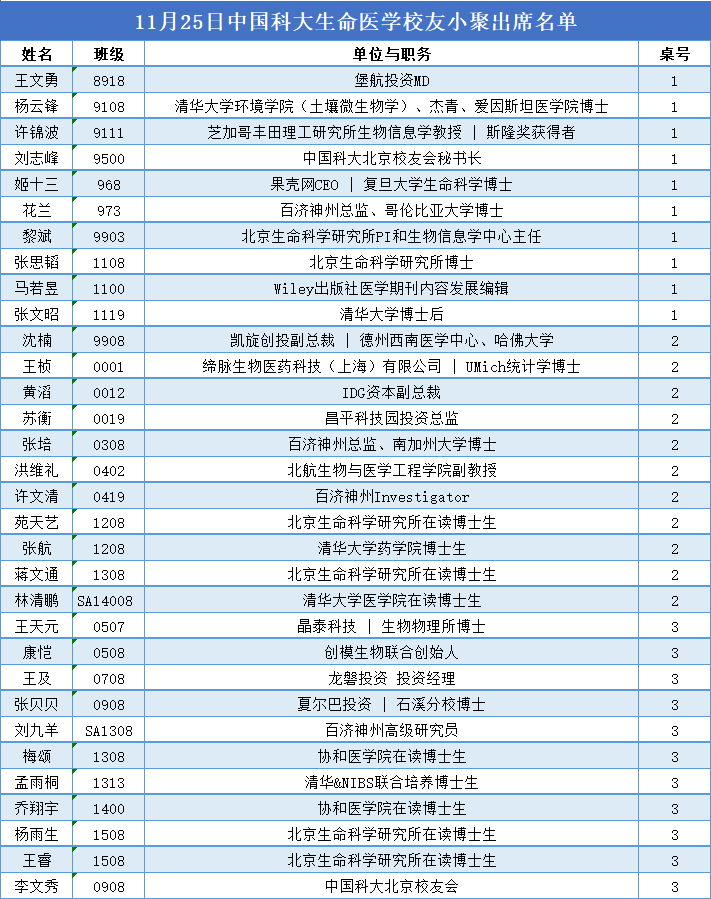 参考名单:如下是2018年与2021年两次由北京校友会进行生医校友会相关名单。北京校友会确信,2025年7月15日的活动将是“过去七年来,北方地区中国科大生命医学校友层次最高的聚会“。