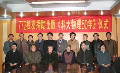 12月18日下午,772校友捐助出版《中国科大物理50年》仪式隆重举行。党委副书记鹿明、近代物理系老师和蒋华、吴自玉、单文钧、丁泽军、周先意等772校友以及校庆办负责人出席了仪式。