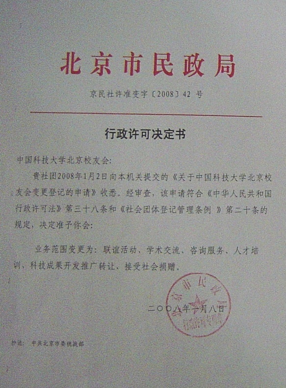 2008年1月8日,北京市民政局下达《行政许可决定书》(京民社许准变字[2008]42号)。该决定书称,中国科大北京校友会在业务范围中增加“接受社会捐赠”的申请,“经审查…符合《中华人民共和国行政许可法》第三十八条和《社会团体登记管理条例》第二十条的规定”,因此批复同意。北京市民政局换发的新《社会团体登记证》在北京校友会的业务范围一栏增加了“接受社会捐赠”一项。据悉,民政局还批复同意了北京校友会章程中增加的捐赠条款。