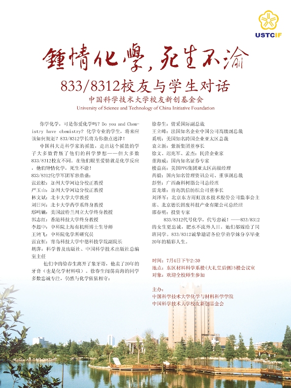 新创基金会感谢中国科大领导与相关部门。侯建国等领导对活动表示肯定。中国科大理学院、化学与材料科学学院、地球与空间科学学院、生命科学学院、管理学院、学生工作部(处)、教务处的大力支持与配合。这里绝非罗列名称行礼如仪!生命科学学院副院长腾脉坤教授专门随同组织者挑选合适教室。838、832海报张贴之后,校友表达强烈兴趣,临时增加座谈时,教务处、理学院等部门往往在几分钟内完成教室分配。在现场发现学生过多时,许多部门立即更换教室。在7月5日上午10点校友建议临时增加下午的企业界校友座谈时,教务处处长刘斌教授立即分配教室。