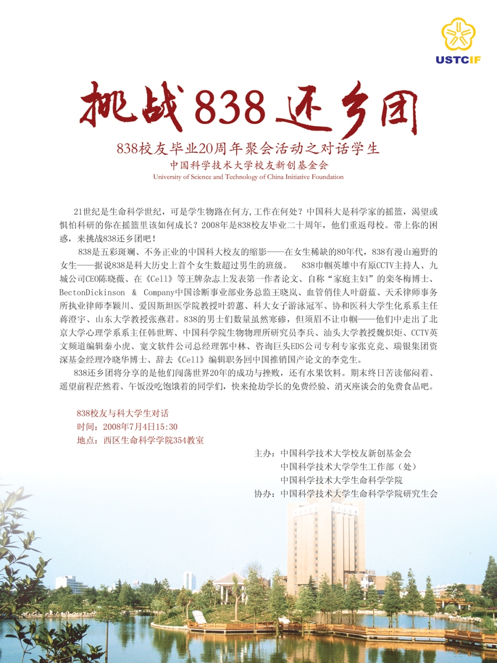 尽管有网友质疑校友对话会海报的格调不够从容大气,但校友对话会抓住了同学关心的最重要问题——学物理(化学、生物)前途路在何方;对科研不感兴趣,将来如何改行?现在是否需要学好专业。 学生的迷惘、郁闷与困惑;校友毕业改行的心理挣扎用“忠诚与背叛,妾身千万难”形容恰如其分。“忠诚与背叛”成为许多对话会的焦点。838与832校友对话会现场,许多校友自我介绍时纷纷辩解“我不算背叛,我不做科研,但还卖物理仪器呢”“他属于一开始就背叛了,校内他就转到别的专业去了”“我属于背叛比较晚,拿到博士之后再背叛,而我投资的领域也需要用到很多生物知识”。忠诚坚持物理学研究的张世伟(威廉玛丽学院物理学教授)也坦然承认当年由于生计压力,给自己定下三年期限,拿不到位置即准备背叛的往事。