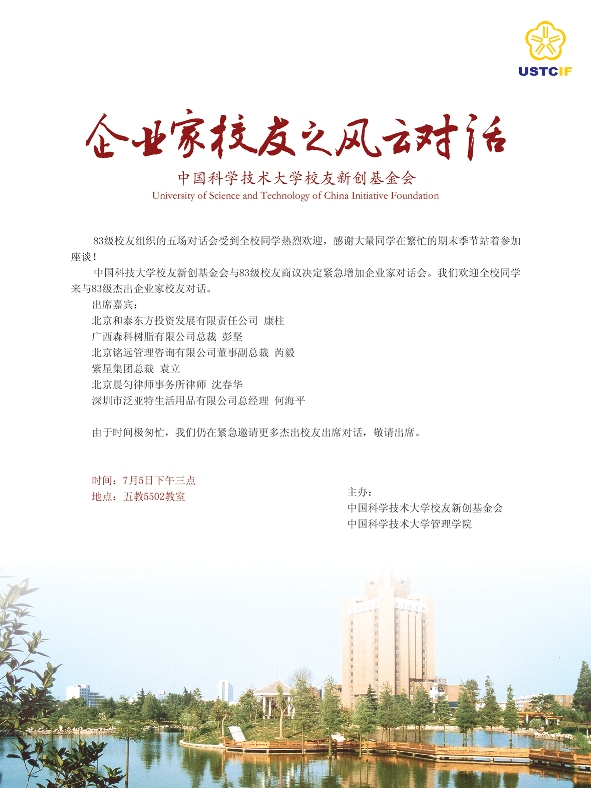 7月5日上午,83级校友临时决定下午增加一场企业家校友对话。由于必须在中午前完成海报制作与通知。这份海报信息和内容都较为粗糙。但下午仍有100多位同学参加。