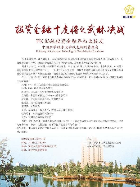 中国科大校园内不缺板着脸孔的学术报告,新创基金会与八三级校友锁定学习基础学科的人生道路如何选择的热点问题,力求以八三级校友的人生坎坷为在校学生启迪人生。而学长们的精彩人生也极大的激励同学的自信。这六场对话会为《忠诚与背叛,妾身千万难——832校友对话学生》《钟情化学,死生不渝——833/8312校友与学生对话》《拷问837地空兵团—— 837校友与学生对话》《对话838还乡团》《投资金融十虎将之武林决战——PK 83级投资金融界杰出校友》《企业家校友之风云对话》。这些系列对话活动受到同学的热烈欢迎。