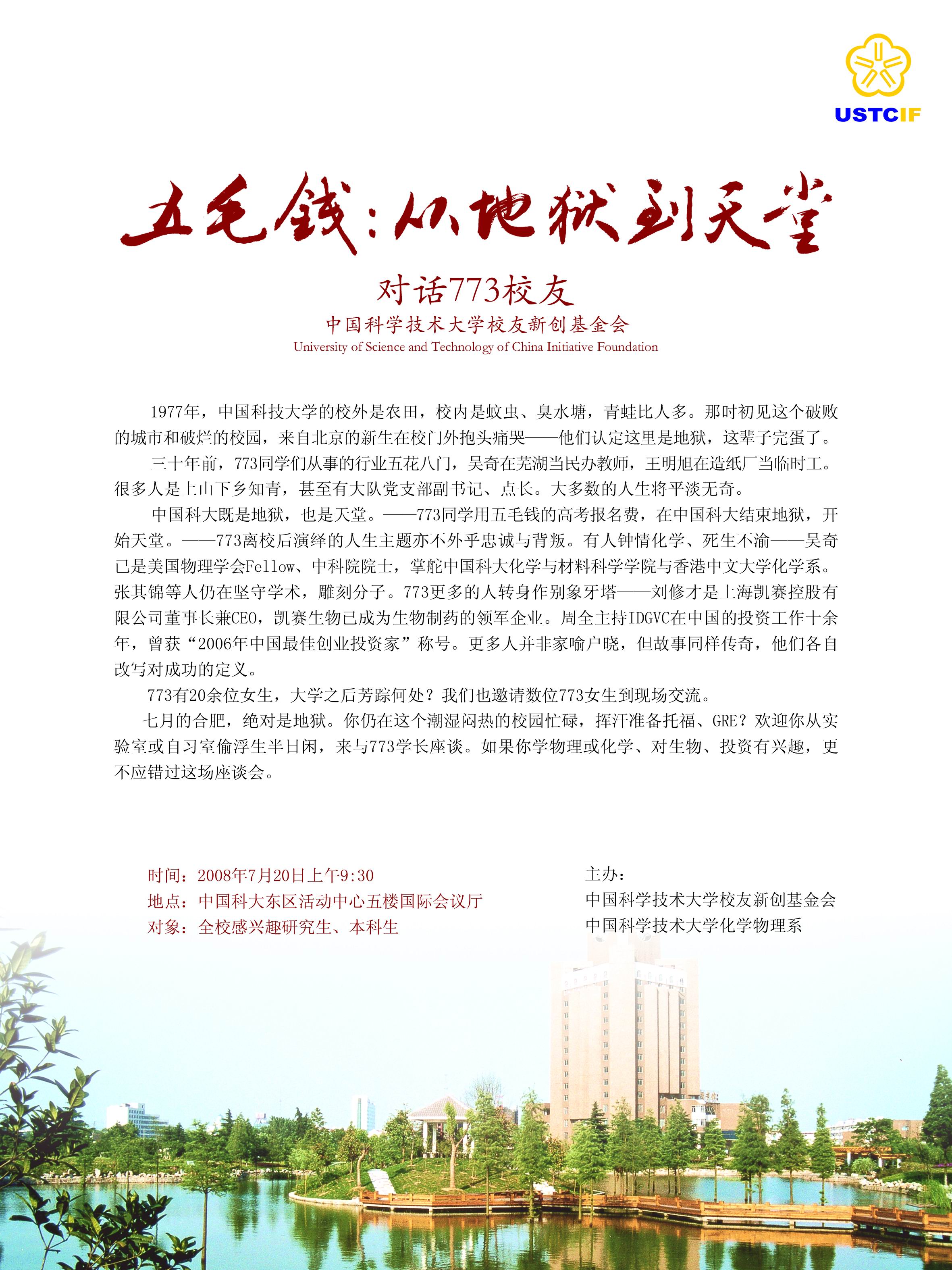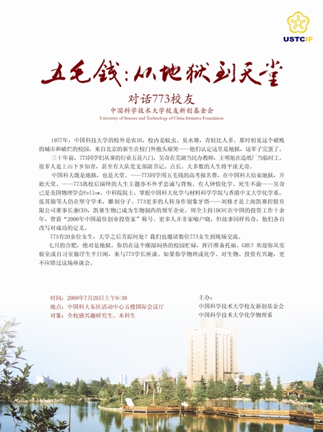 2008年7月20日上午,返校团聚的773校友来到中国科大东区活动中心国际会议厅与数百位同学畅谈他们三十年的人生经历。