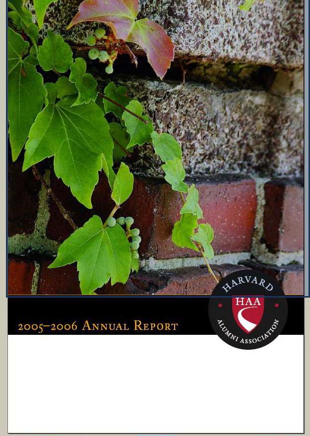 哈佛大学校友会年报封面,绿叶点缀红砖,衬托的是哈佛厚重的历史。