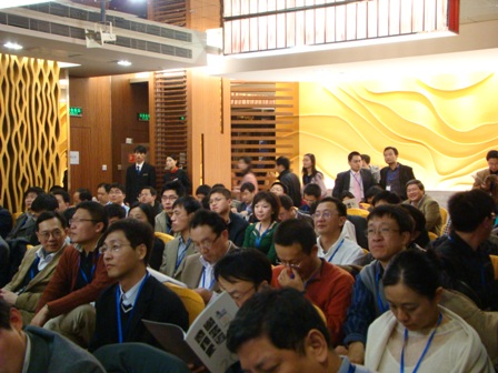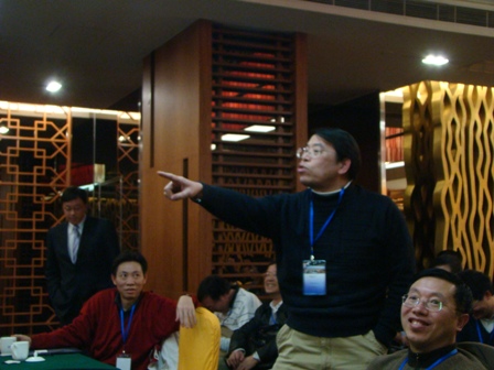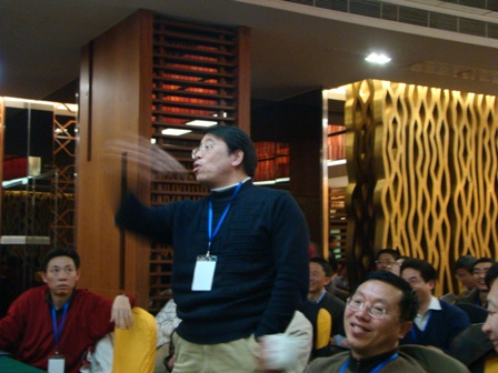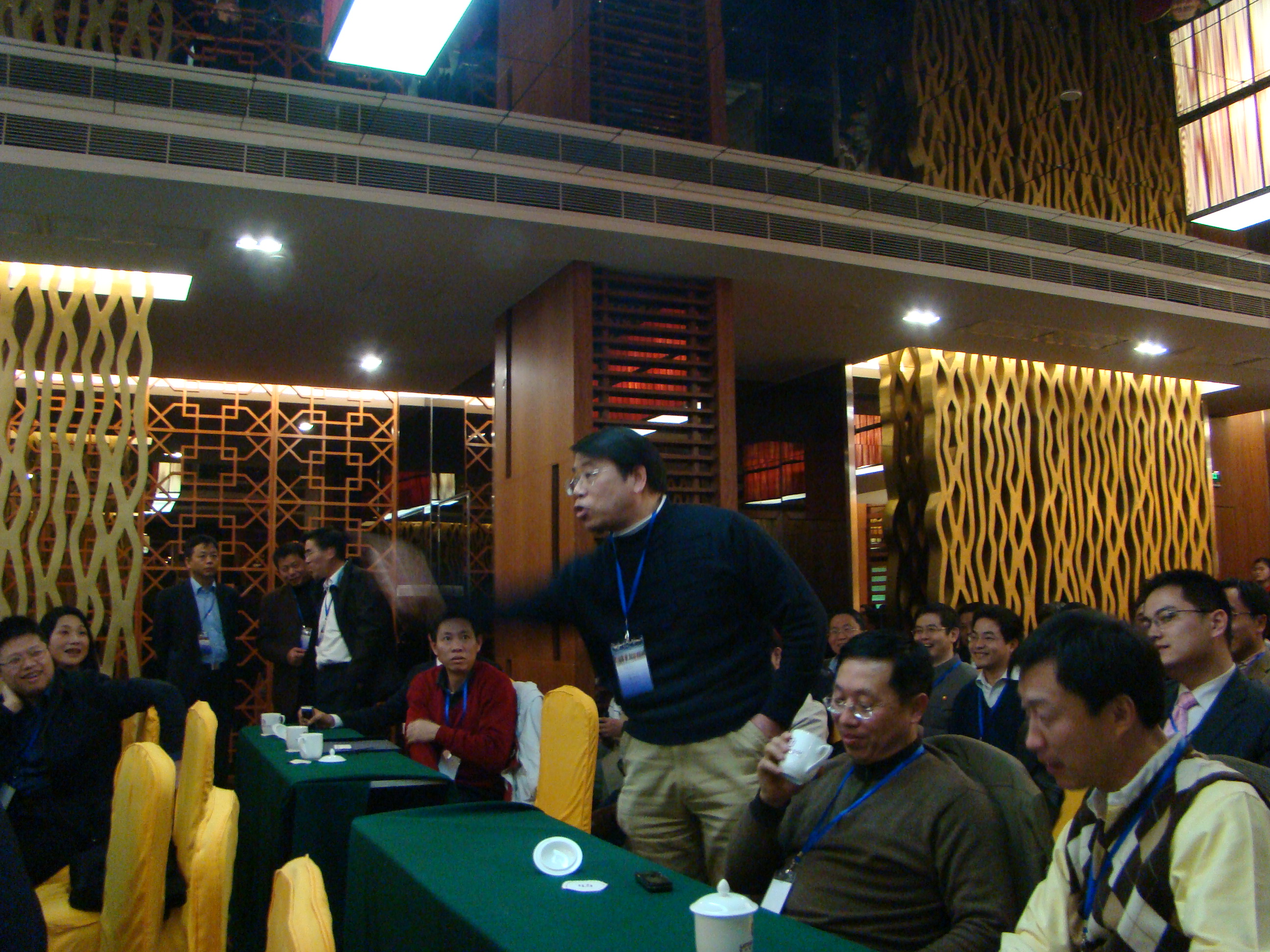 主持人张树新建议“等侯校长讲完,您再说”,黄斯明继续批评“科大坏就坏在都是学物理的人掌握权力!” 图中詹正茂、张健、胡伟武、张福新、郭胜利等多名校友讪笑中,但掌影下的杨铁神情略显紧张。