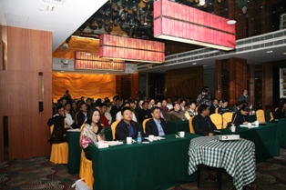 会场紫光国际交流中心紫悦厅:校友正在听取侯建国的演讲《努力办成世界一流研究型大学》。