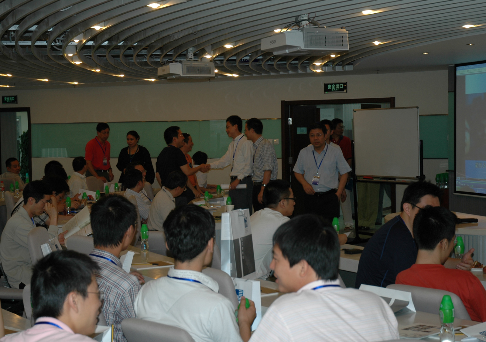会场一角:何宜杰(9316硕士,距镜头最近,穿白衣者)与夫人在聆听演讲。镜头远处托腮女生为海归仅仅数月的中国银监会黄直(95少,哥伦比亚大学博士)。镜头远处引颈绿色体恤男生为三星研究院吴起博士(95少)。