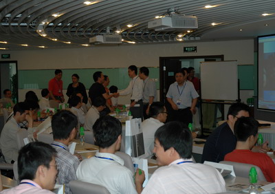 师生相见欢:施忠(8516,左,穿深色T-shirt者)与赵昊(8211,穿白色衬衫)握手。施忠是长江商学院EMBA第三期校友,赵昊是他在长江求学时的论文导师。