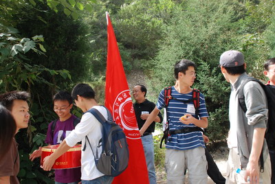 把蛋糕高举起来,插上香山的高峰!——图为贺振鑫、杨新杰与范晓轩(从左至右)三位05级校友组成的蛋糕敢死队将蛋糕顺利带上好汉坡后合影。