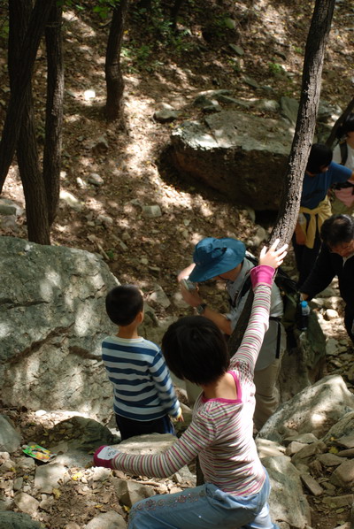 李骁军登绝壁甜蜜小憩中。李骁军警告”你们会骂名千古!谁说香八拉是残奥会项目的说?“ 出发前为校友打气,组织者忽悠校友”专业人士20分钟能上去!" 半程过后,众人骂声四起,皆乎上当。