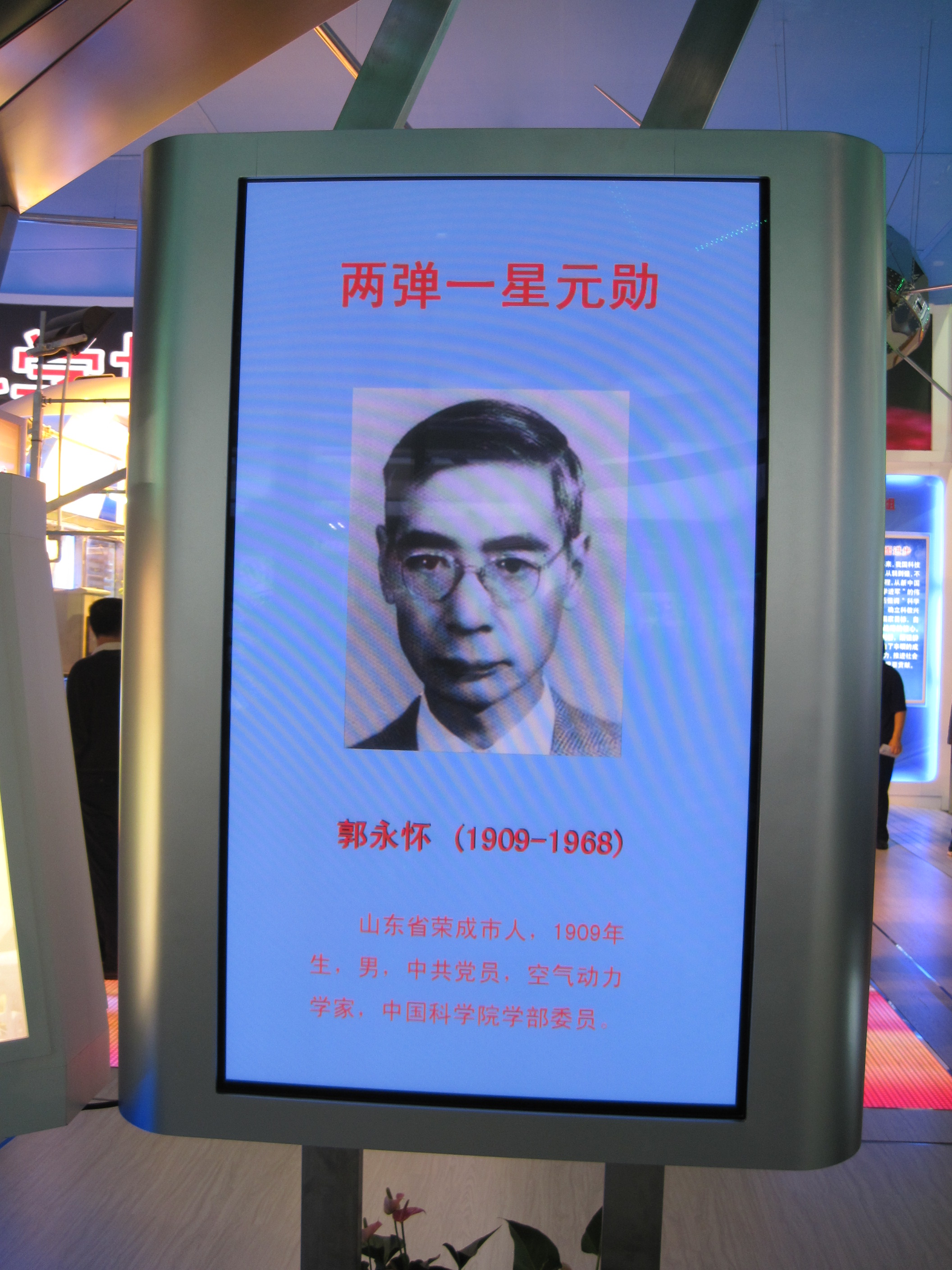 中国科技大学首任化学物理系系主任郭永怀的“两弹一星”勋章出现在科教展区入口处。该展品从中国科技大学征集。展品中的说明为“2003年9月,郭永怀夫人李佩将其捐赠给中国科技大学珍藏”。