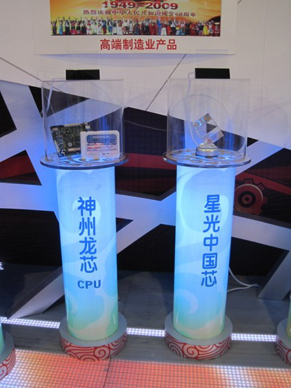 展示中国信息技术成果芯片制造技术突破的版块。图中为神州龙芯、星光中国芯并肩而立。巧合的是两种芯片首席科学家或总裁均为中国科大校友。星光中国芯负责人为中星微总裁邓中瀚(877)。