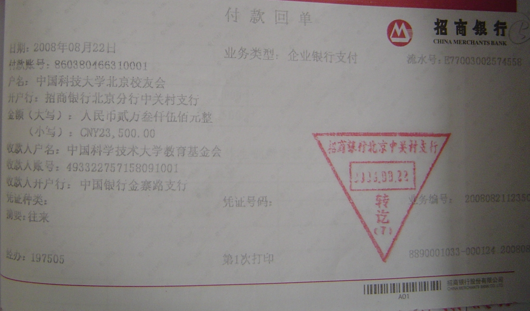 “张作生纪念基金”移交的受赠收据及银行回单。