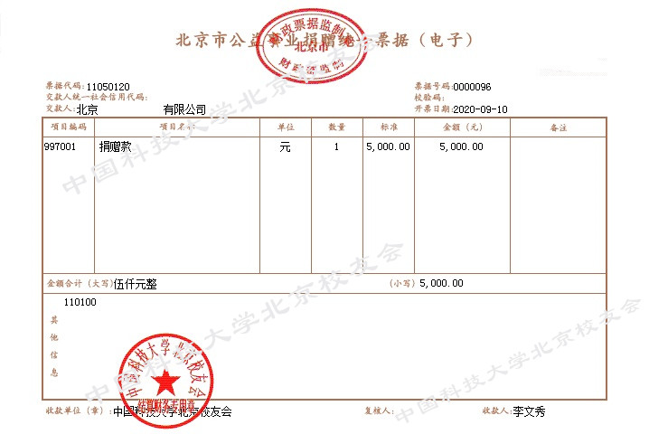 为便于捐赠校友或企业及时、快速收到公益事业捐赠票据,继而申报个税减免等相关事宜,根据北京市财政局关于印发《北京财政数据证书使用及管理办法》的通知(京财信息〔2016〕2648号),中国科大北京校友会通过积极申领,已于2020年4月成功申领“北京市公益事业捐赠统一票据(电子)”及“北京市社会团体会费统一收据(电子)”,即可通过系统将电子票据便捷的发送至捐赠校友或企业联系邮箱。